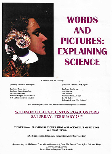 1998. Initiated, convened and organised the first Words and Pictures Explaining Science conference, Wolfson College, Oxford; aimed at showing writers, artists and scientists how to collaborate (sponsored by Wellcome Trust, Pfizer, Oxford Trust) Speakers included Prof. John Carey, Prof Ian Stewart, Tim Hunkin, Prof. Susan Greenfield, Dr Georgina Ferry, the Art Editor from New Scientist, and representatives of the Arts Catalyst, Wellcome Trust and the Gulbenkian Foundation.